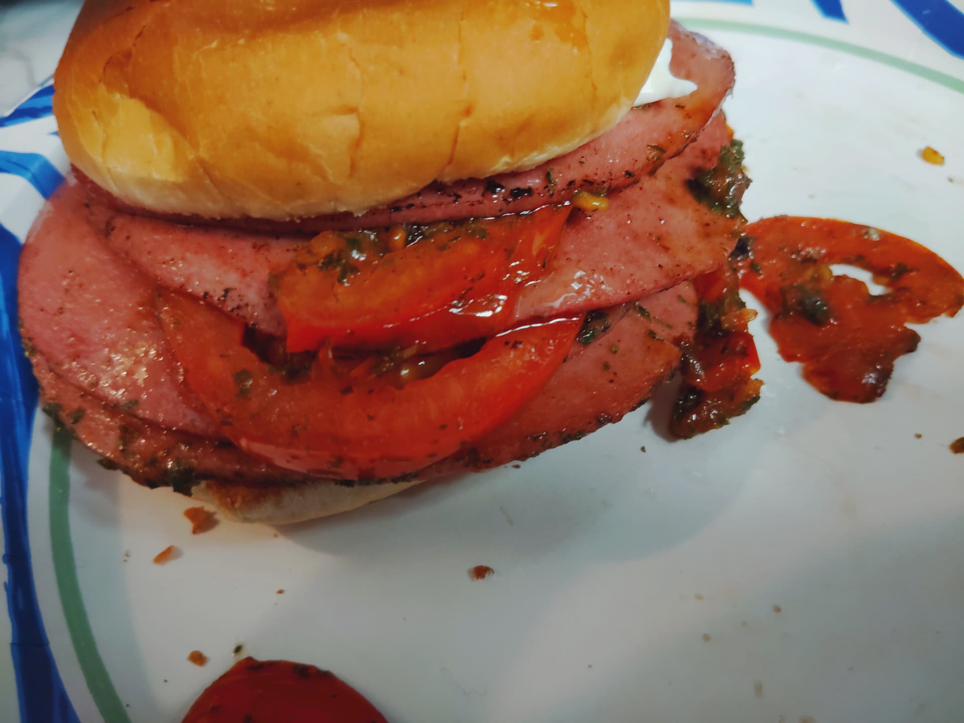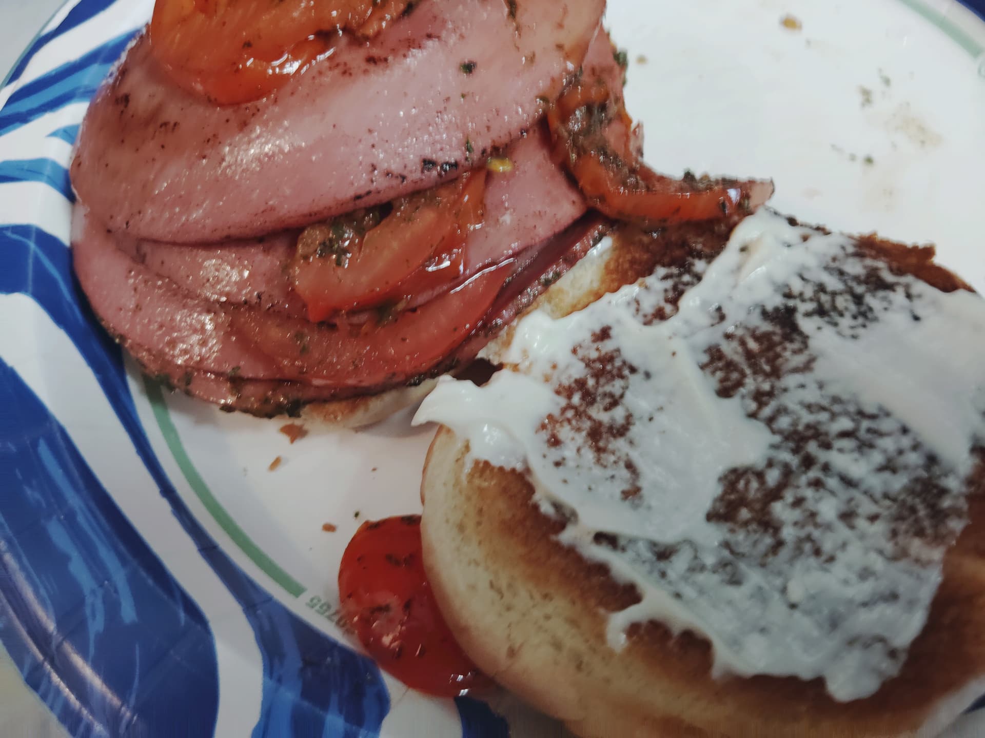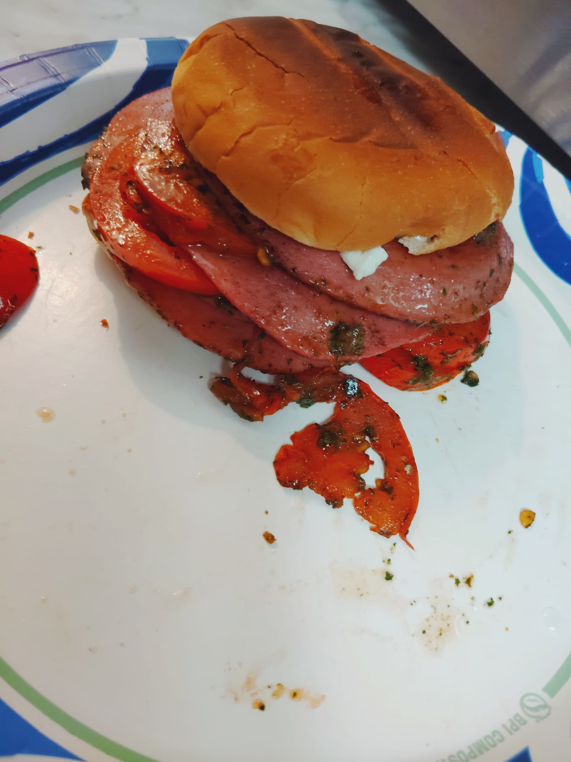 I burnt the bun and poured out the parsley wrong but all was perfect. That’s just a little olive oil, the bolony, tomatoes, parsley, mayonnaise, and a bun. I did 4 slices and 1 roma tomato. Note.cuppong of the bologna but this more convex not the usual concave. See how it improves with heat plus tomato acid and lycopene.