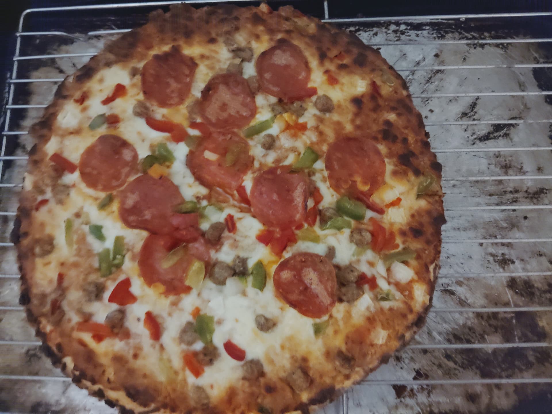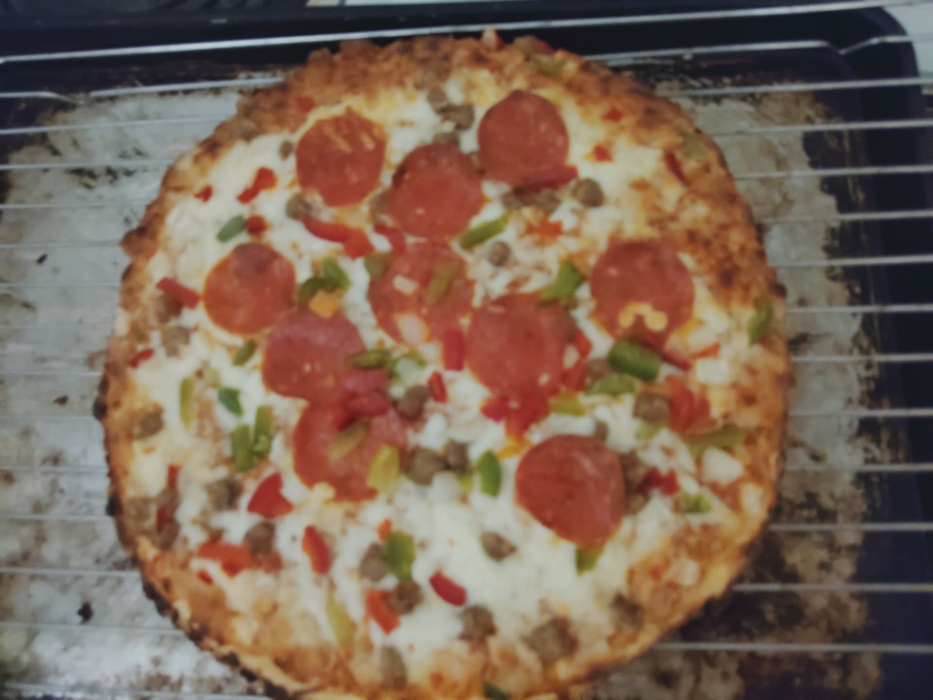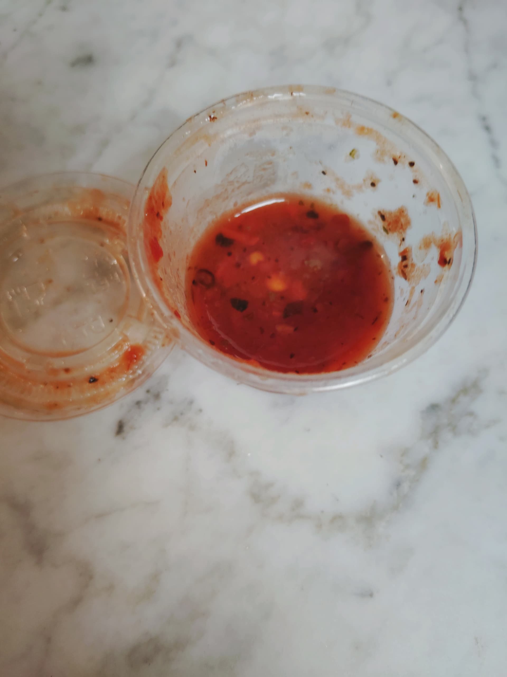 I really want to do red today. This was my breakfast. Yes Greg my mother bought me another frozen pizza because it makes her happy. This was a Red Baron. Only difference with this was I used a rack to cook it so air would get underneath. It says bake on tray or directly on oven rack but that will make a mess with droppings on the heating metal.. I did defrost it first too. I tried taking it out at 16; minutes at 400 but put it back in for the recommendation of 18 -20 for rack, opting about 18. I had some leftover salsa from the place that makes the pizza sauce tasting salsa I like , so this was quite the angry menace.