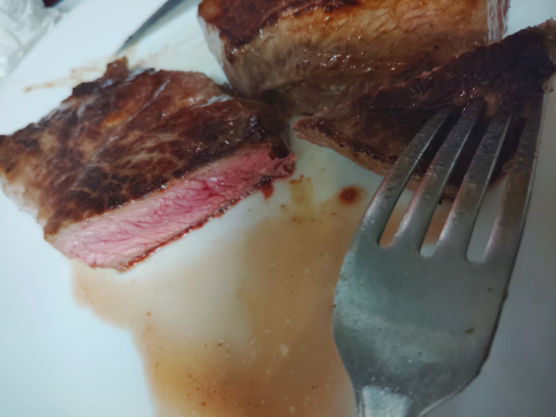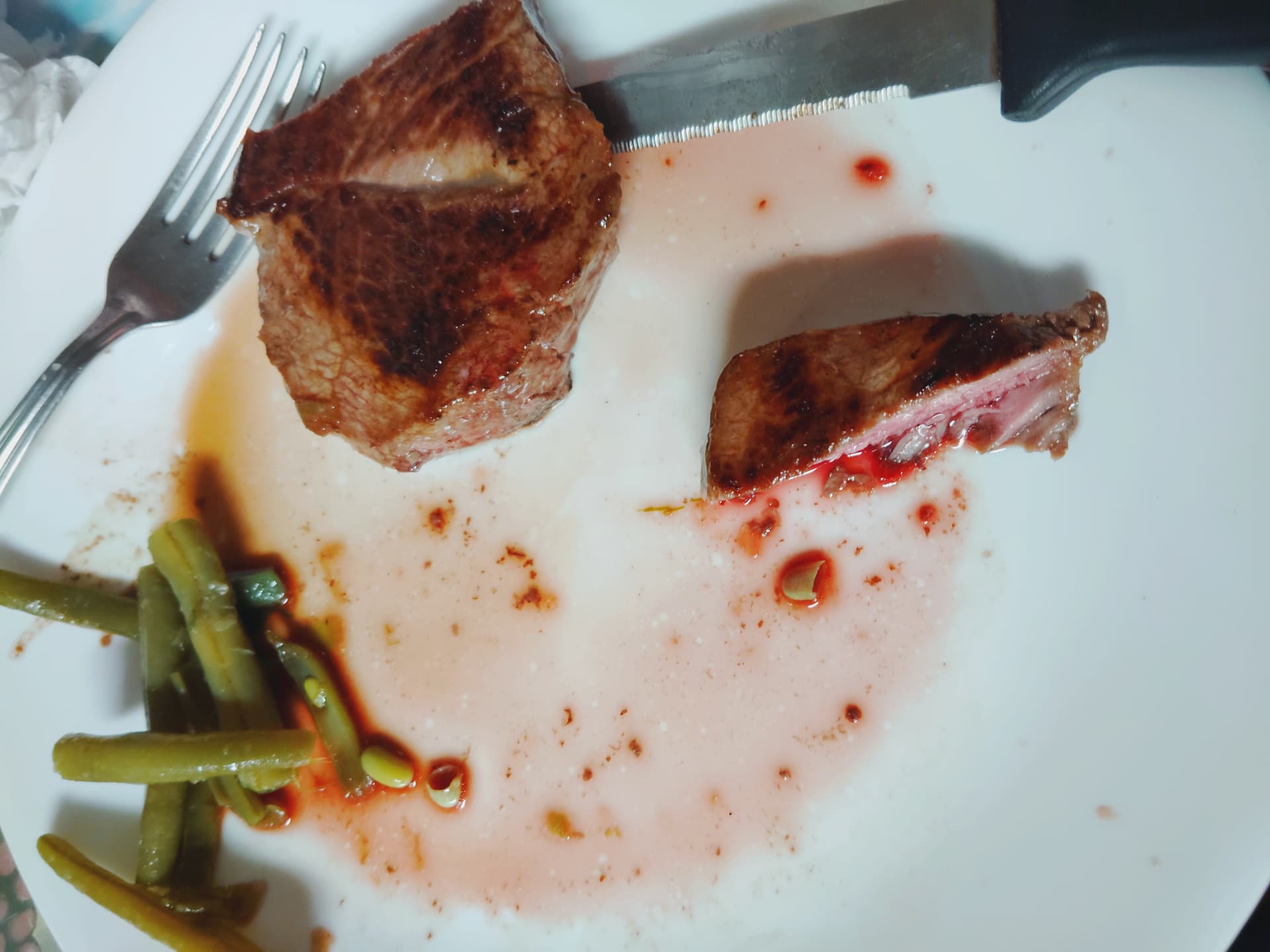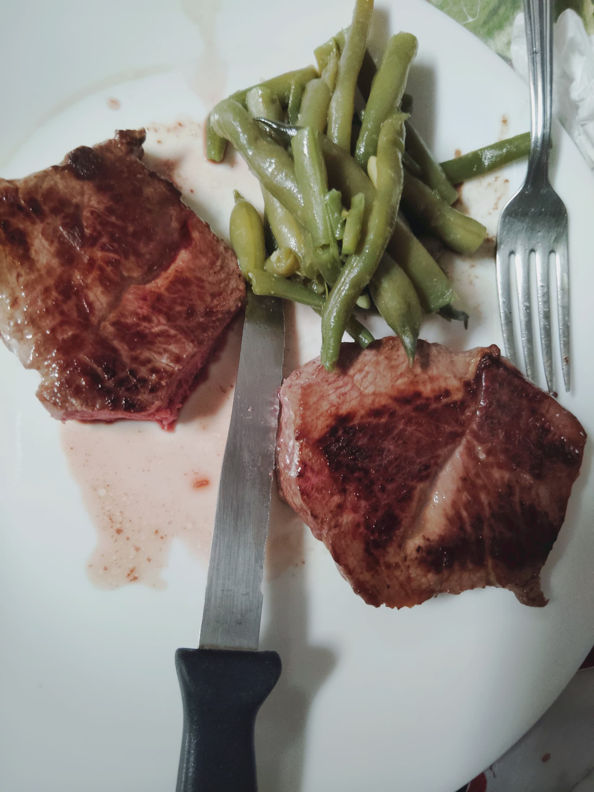 This was dinner mom made. Just a drop of soy sauce to flavor the oil. She even cooked it medium rare. Just added some green beans. More and more of my meals will look like this.
