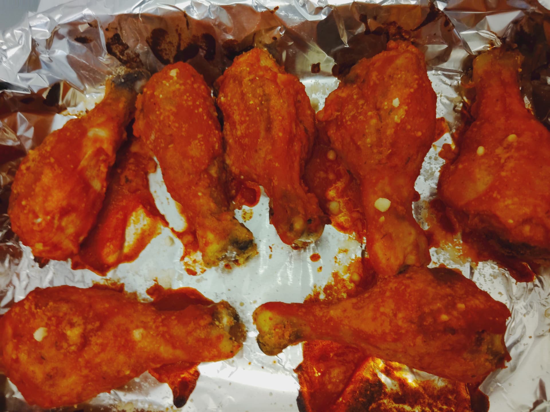 My mom scraped my chicken legs and was going to put them back in the oven with some olive oil spray for a touch up. This was a huge opportunity for me to nullify several quarrels and contentious by just agreeing over chicken. Soni had her just make some tomato sauce and brush them over. She added some parmesan and they came out great for an additional 20 minutes at 380.