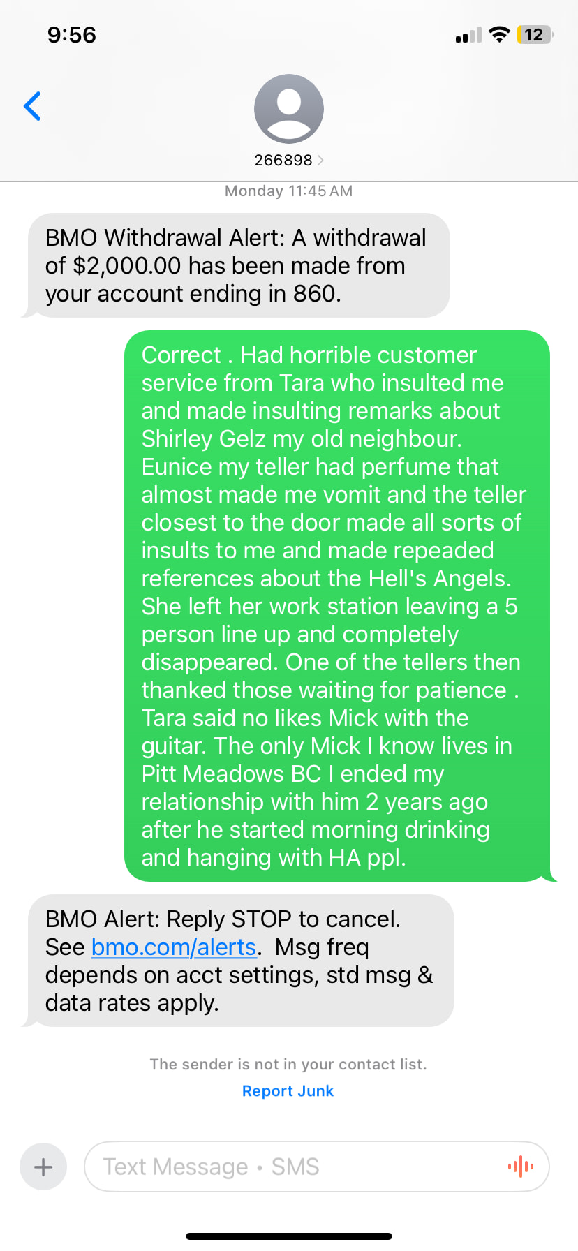 Was at the Parksville BMO today. Chi Thé Asian teller gave good service. The other teller greeted a customer who walked in and told her that they were not allowed to talk about Shirley Gelz. The bank has not responded to my original complaint. Branch transit # 3820 10:05:53 AM.
