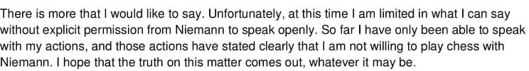 This is totally right. Magnus implies in his statement that he has more proof but needs Niemann’s permission to talk. That’s unconvincing. That said, Magnus has the support of several other GMs so maybe there’s something here.