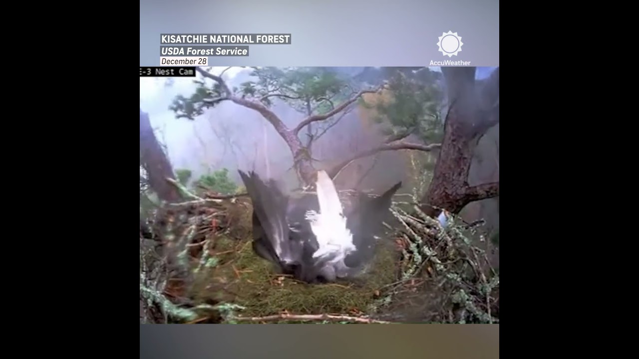 This eagle however shows it power by not taking flight in a powerful hurricane and protecting its eggs.