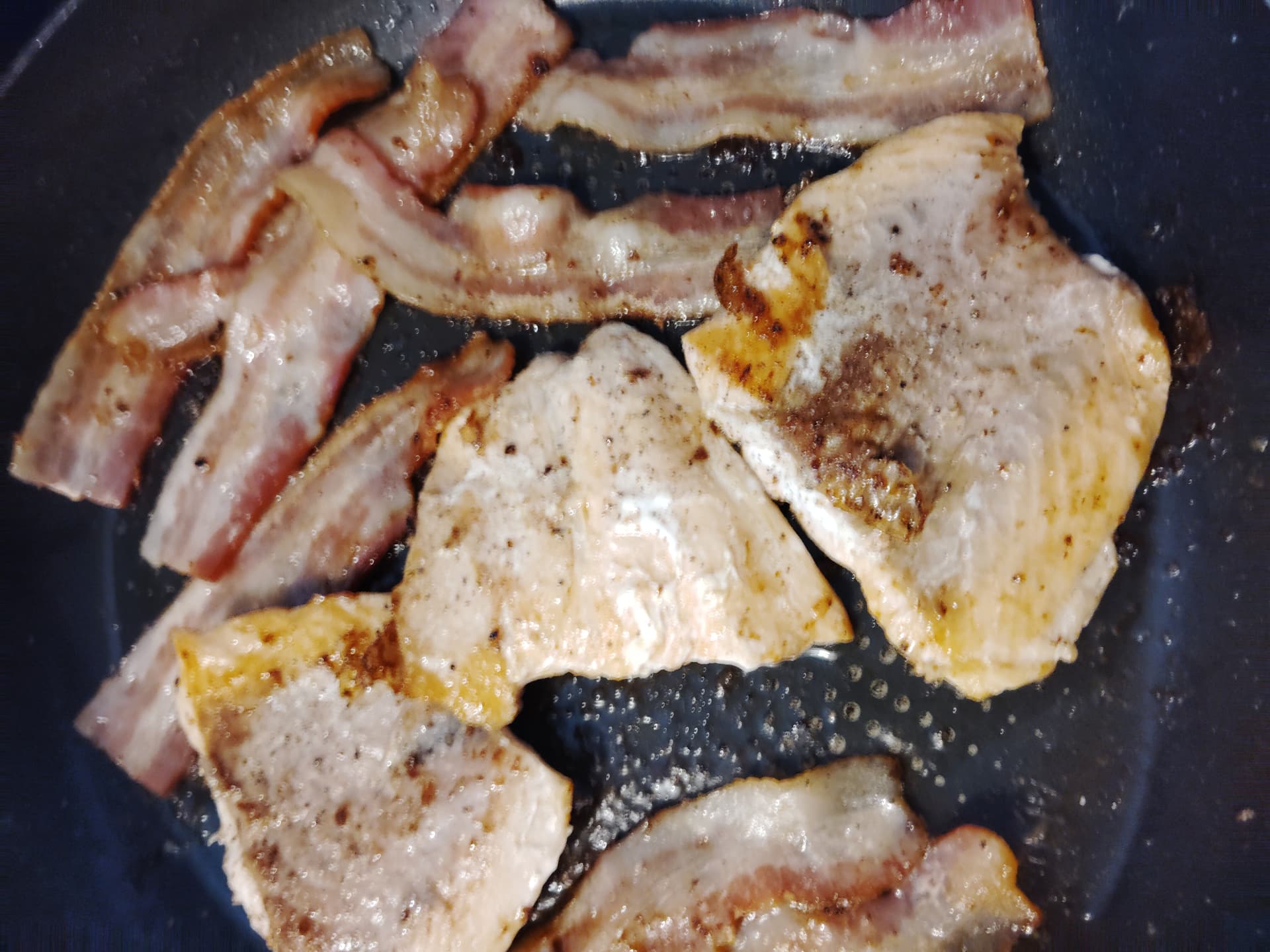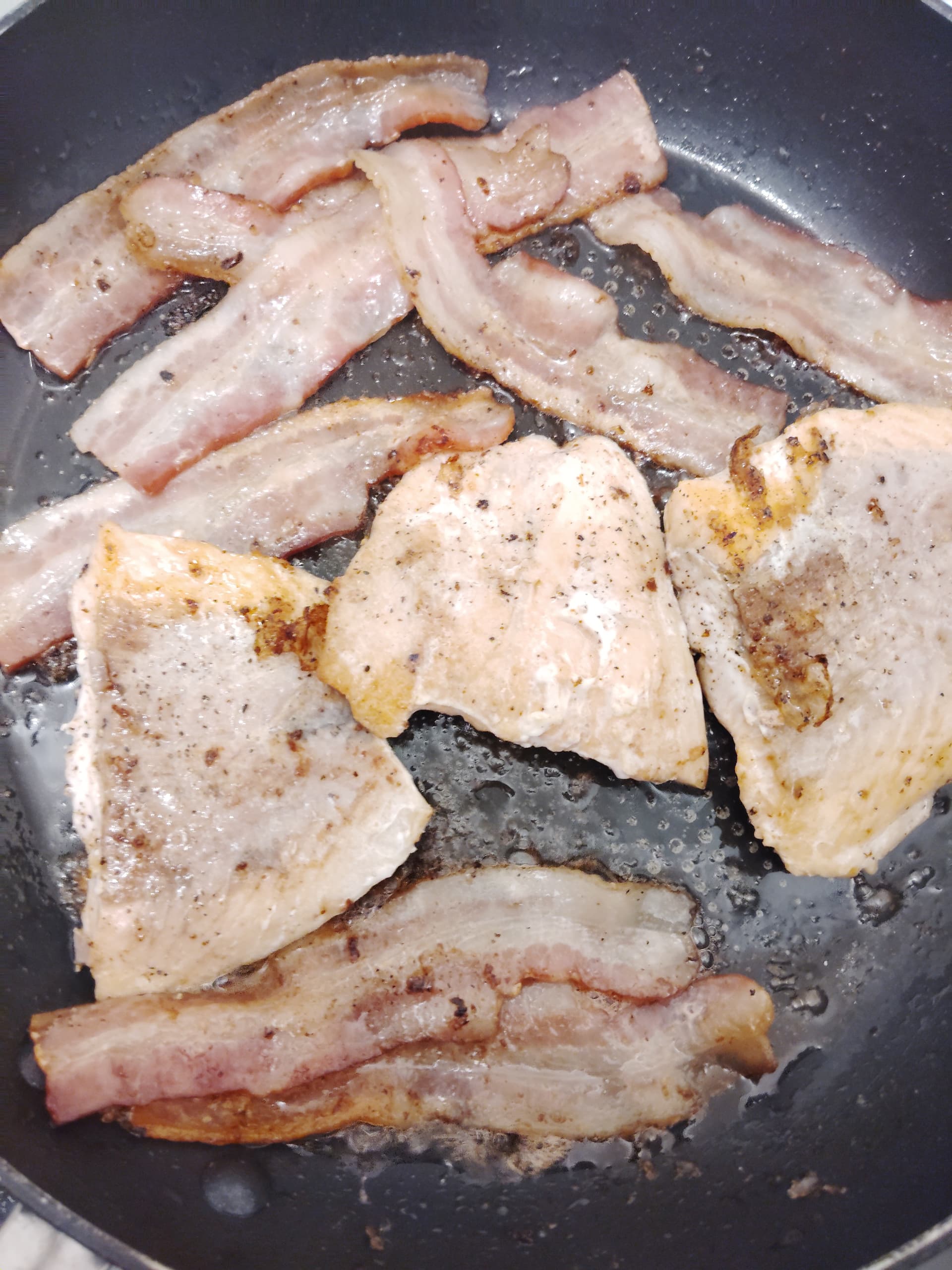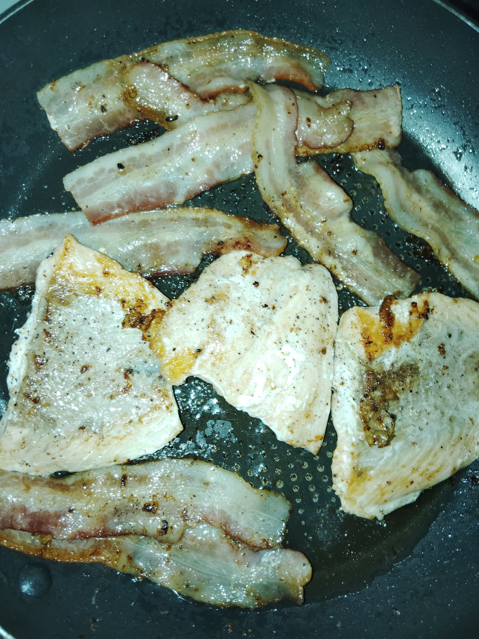 Greasy. Pink salt and black pepper. I’ll add lemons to the salmon. I didn’t even bother to wipe the old grease and burnt egg flakes.