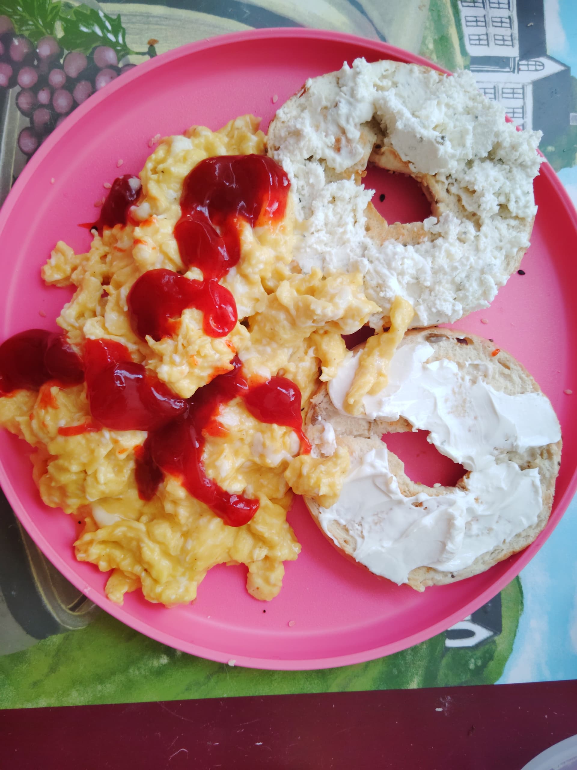 Today I filled up on breakfast with some last pieces of salmon and eggs and a bagel. No butter but a garden spread and some cream cheese. That’s not ketchup , it’s actually banana sauce with red and yellow food coloring. Yeah those eggs are runny and with that sauce they are going down like banana slugs. Not thinking just getting down what I feel triggers instinct.