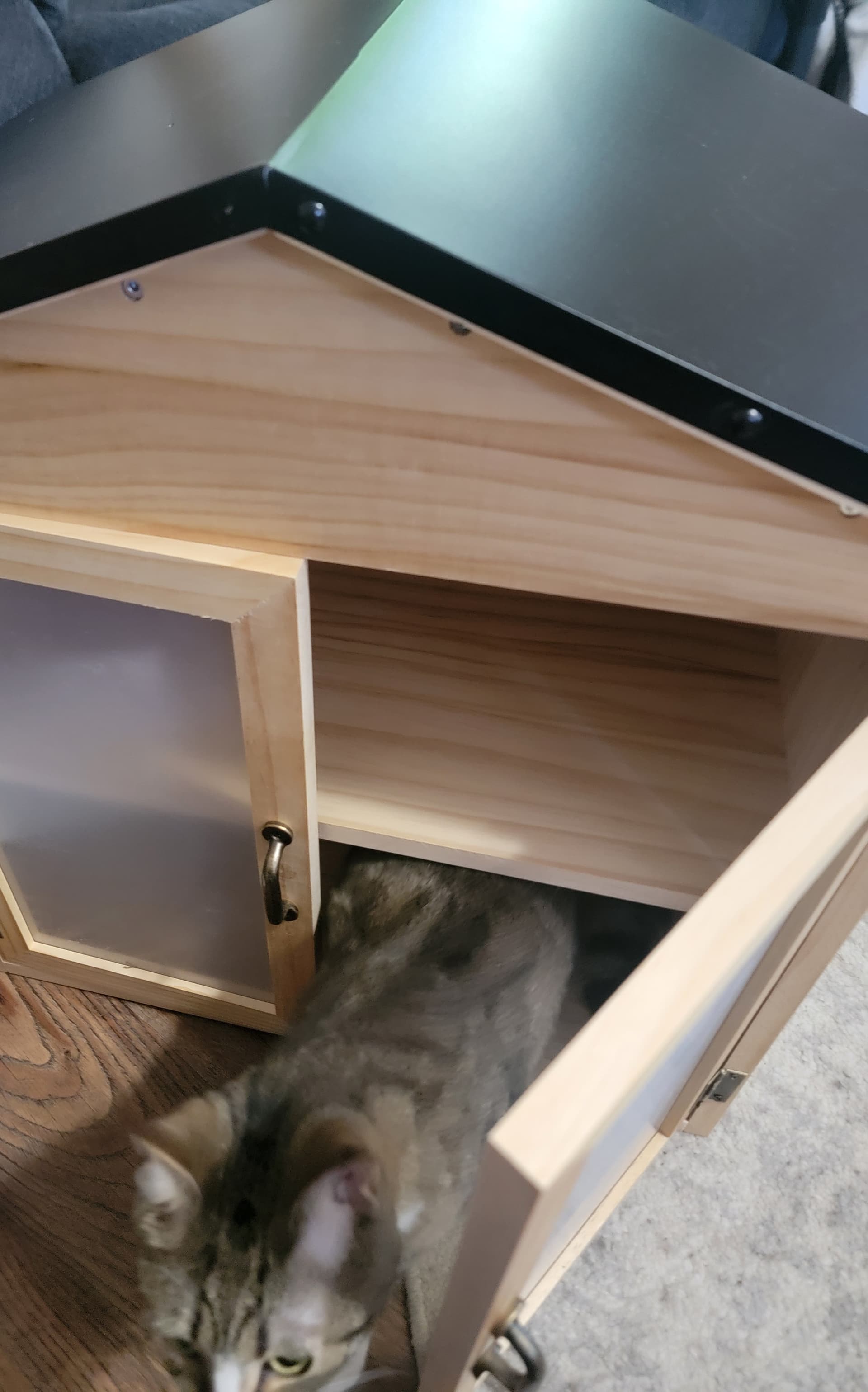 It is a little bigger than I was hoping. I need to possibly paint it gray to match our house. Or just polyurethane it. It could use a magnet on the inside. I am worried about elements and vandals. Less so about thieves. Just hope everything stays dry. I am planning on putting it on a pressure treated post, stick that in a plastic bucket with concrete and put that in a planter. It’s going to way over 200 lbs when all done, but don’t really want to stick it in the ground.
