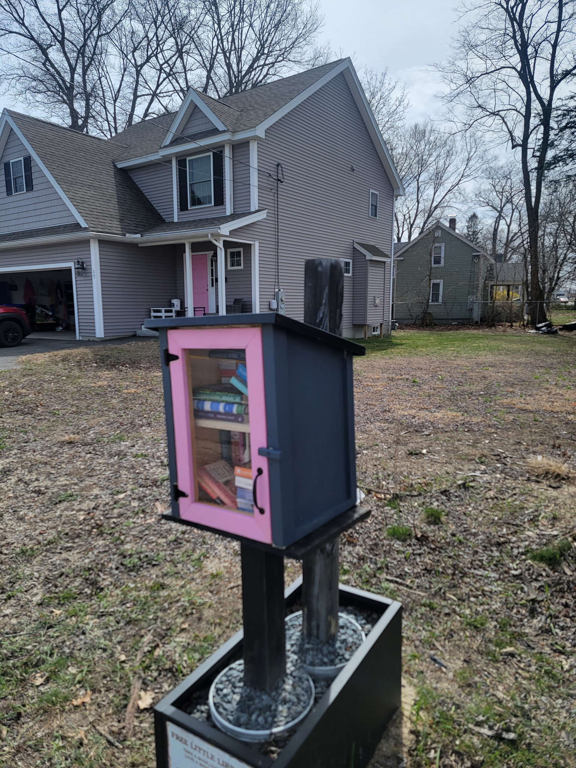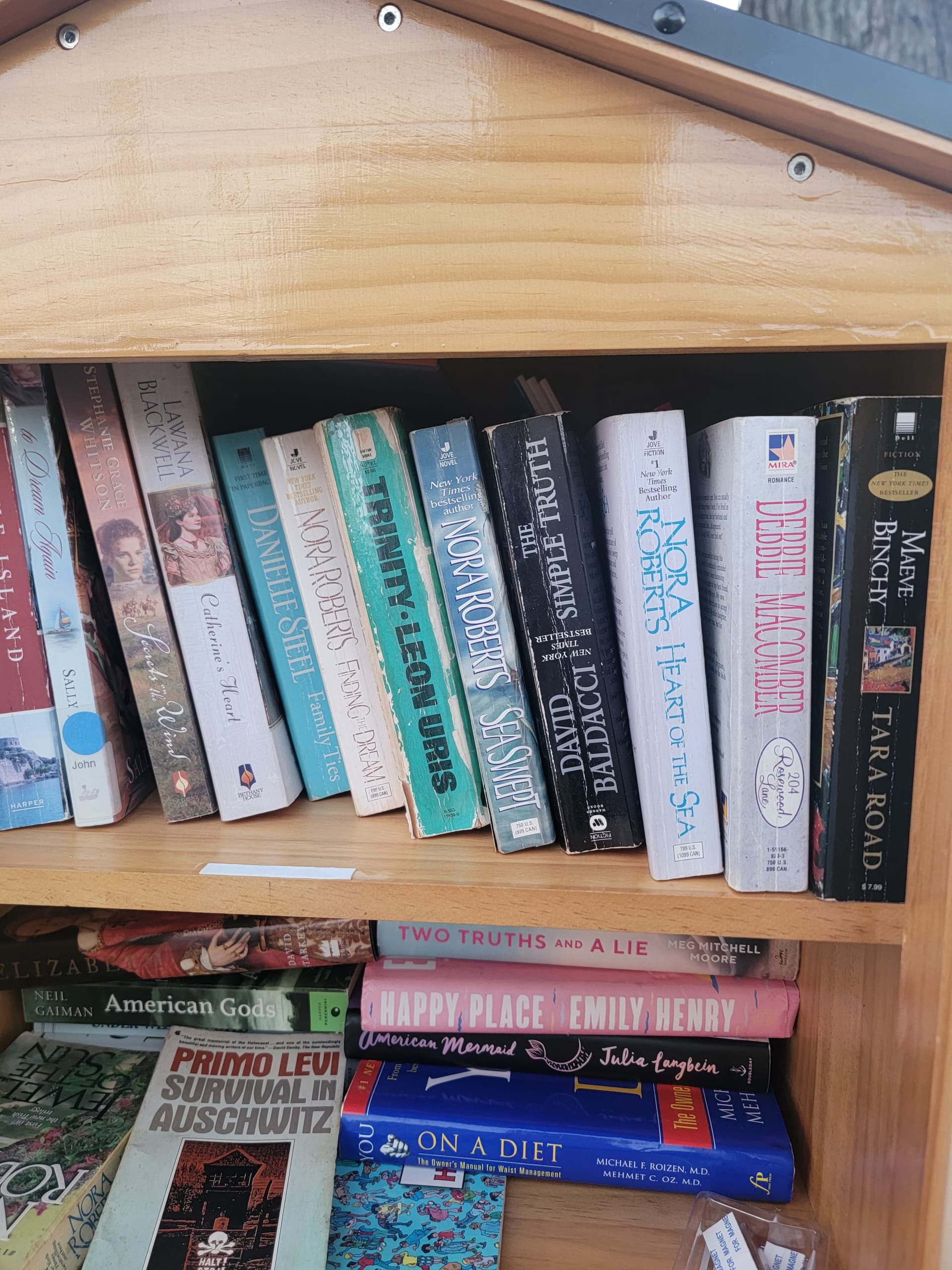 A few months ago we had 70 mph winds. Half the door to the library ripped off. We also had 2 feet of snow on the ground, so nobody was really using it. Due to it being January, I took all the books out. Somehow, only about 5 were wet. I put a tarp over it and drilled it into the post behind it.