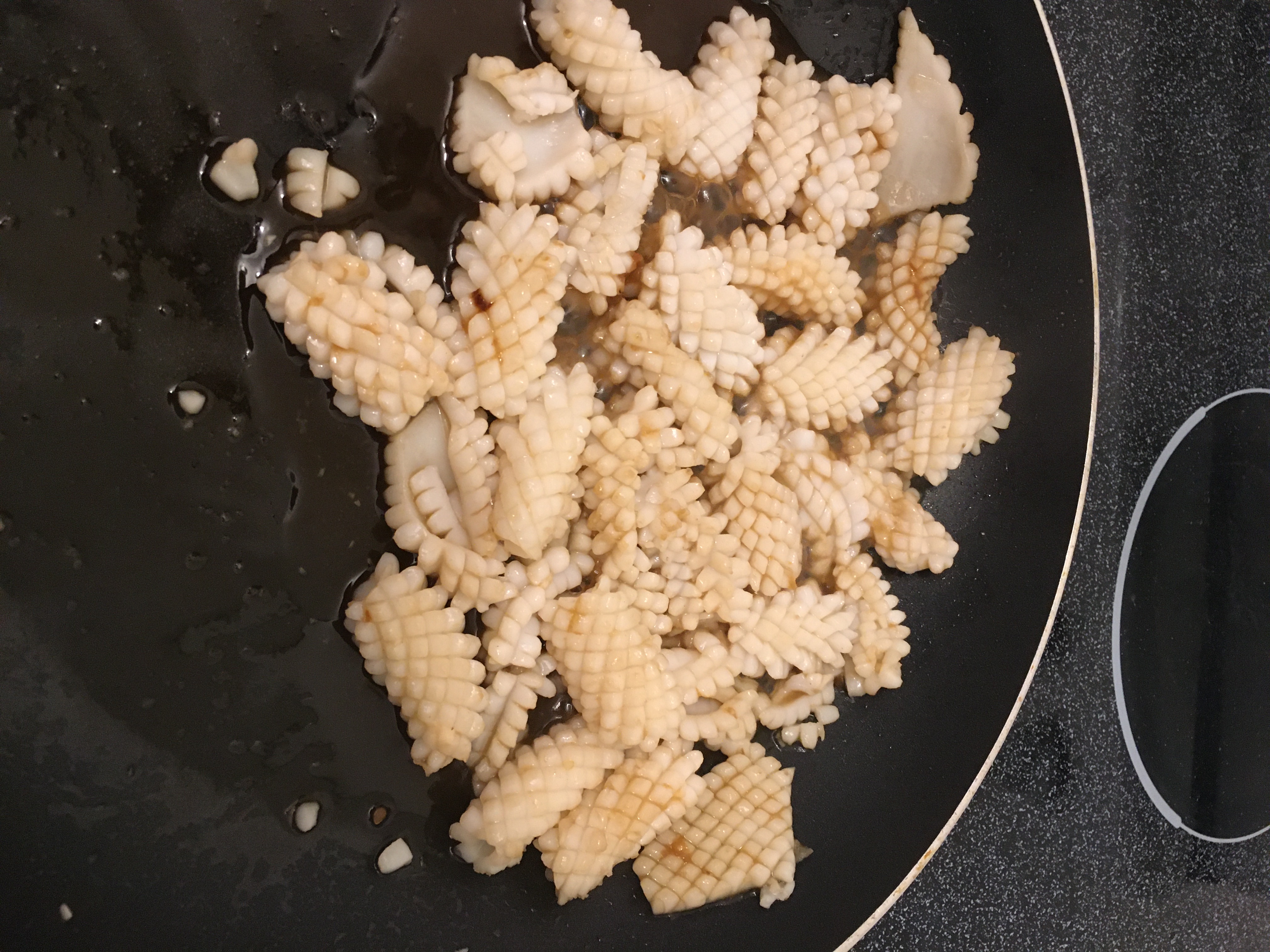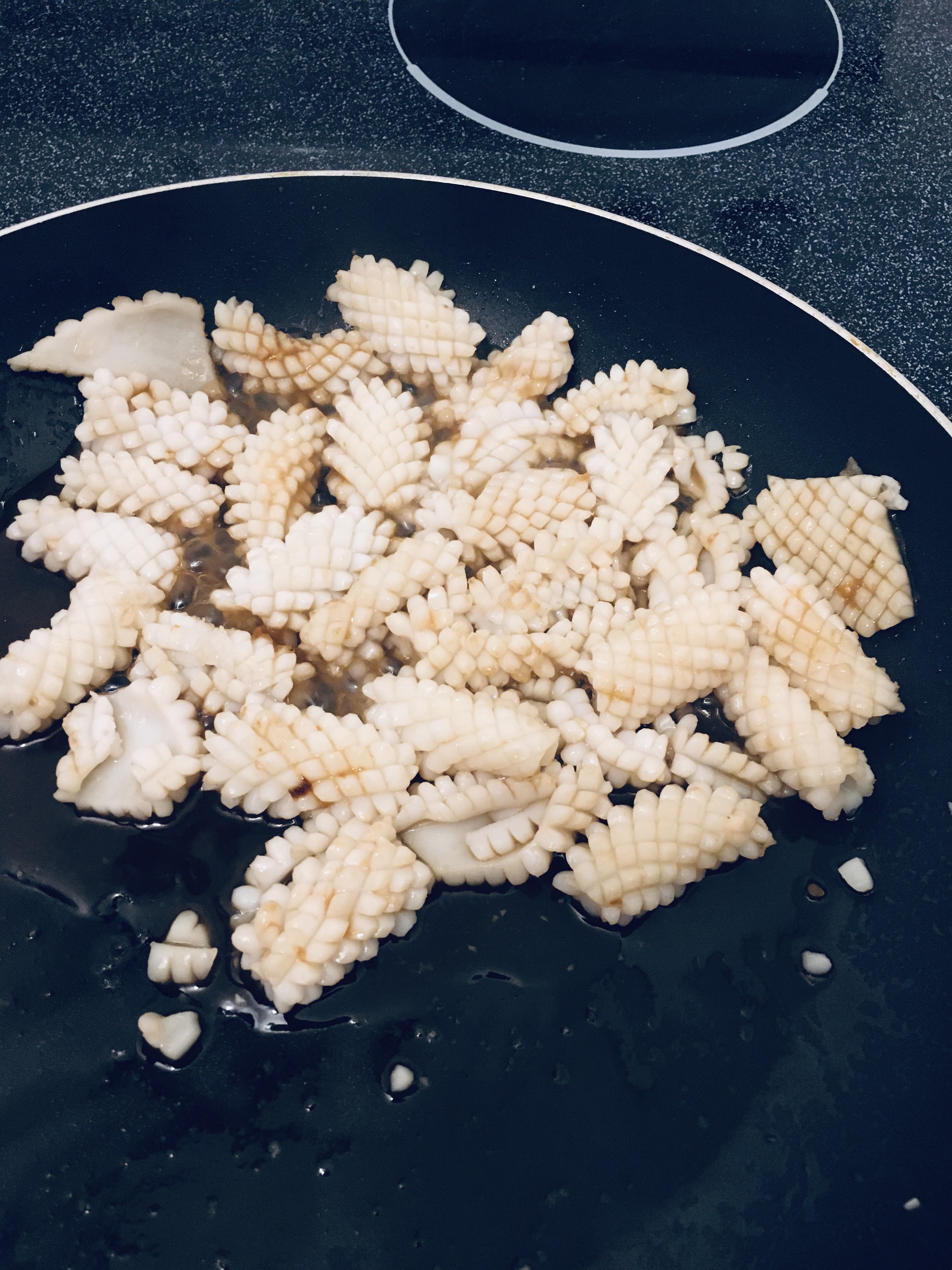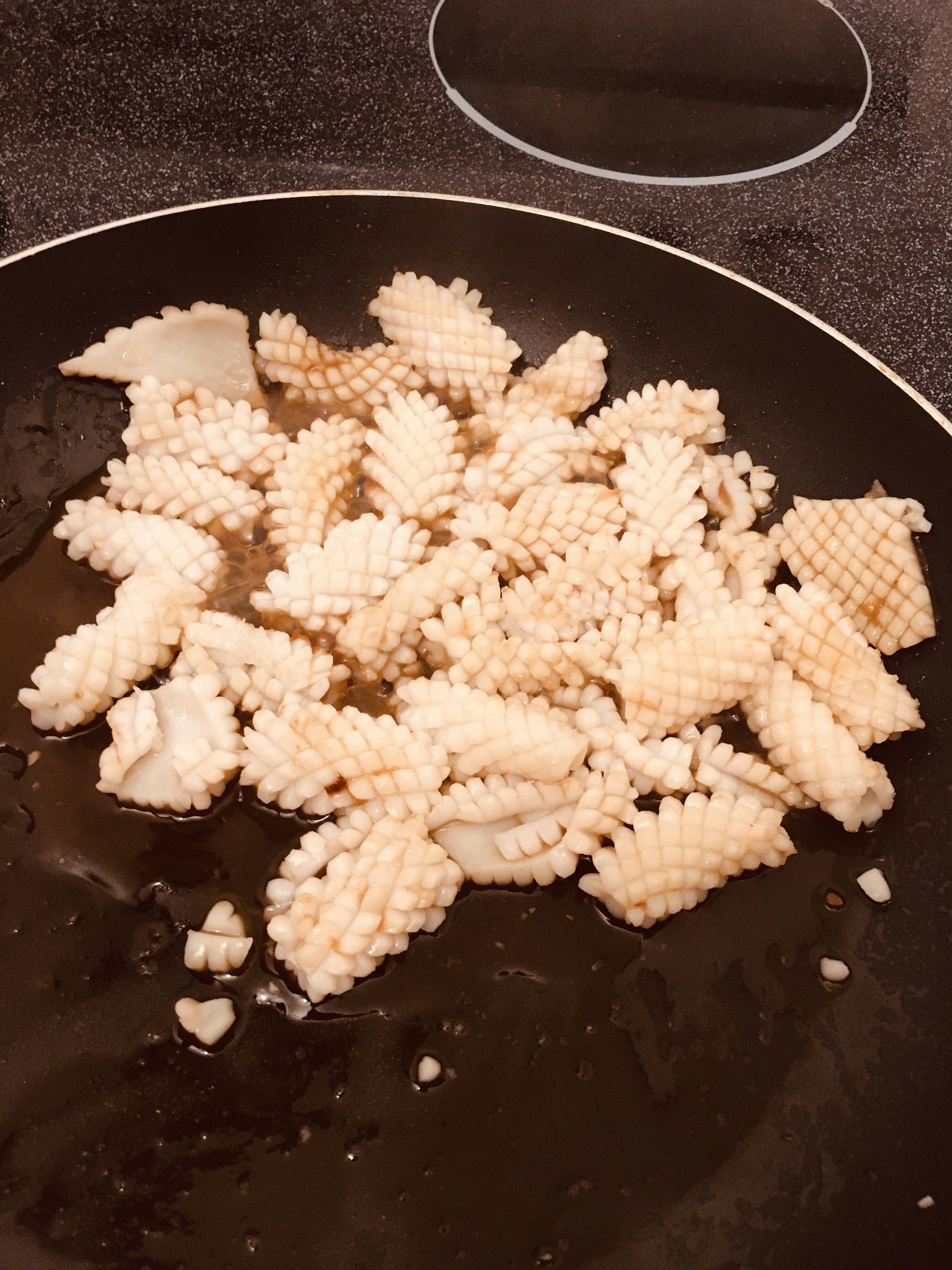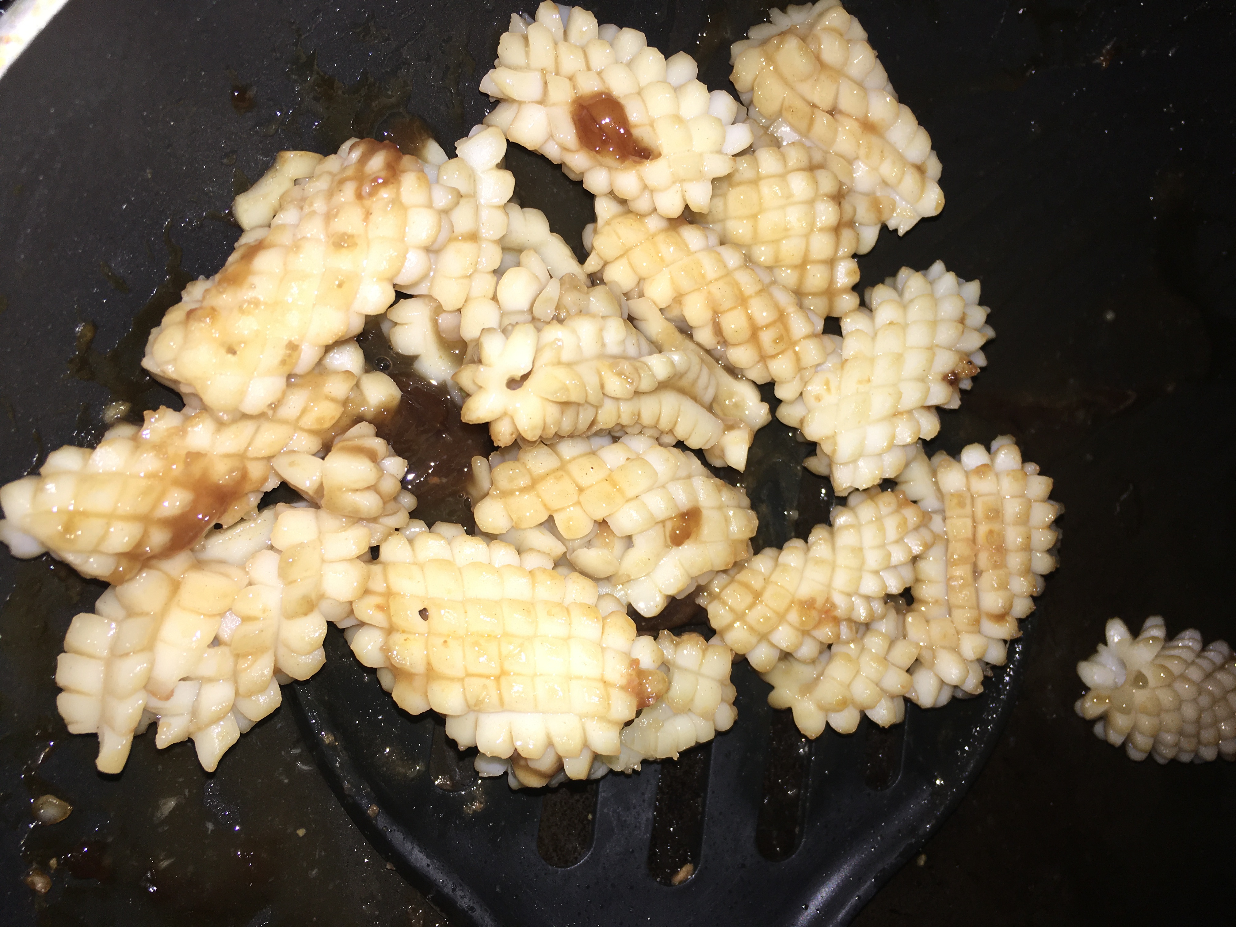 And some squid. Maybe youhave seenthis before. They are called sculpted or balnched pineapple. Balnching removes all the skin but their is still some sliminess. I wish I had some potatoa salad and some green salad with vinegar an soft mushy rice to eat with this as I tried it that way the first time I ordered this long ago. They have a nice texture and and the taste is ok. Like squid steaks. Not so much magig, Iâll show some squid magic later but these are good if you want to make something asian. The white squid milk isnât good for anything.