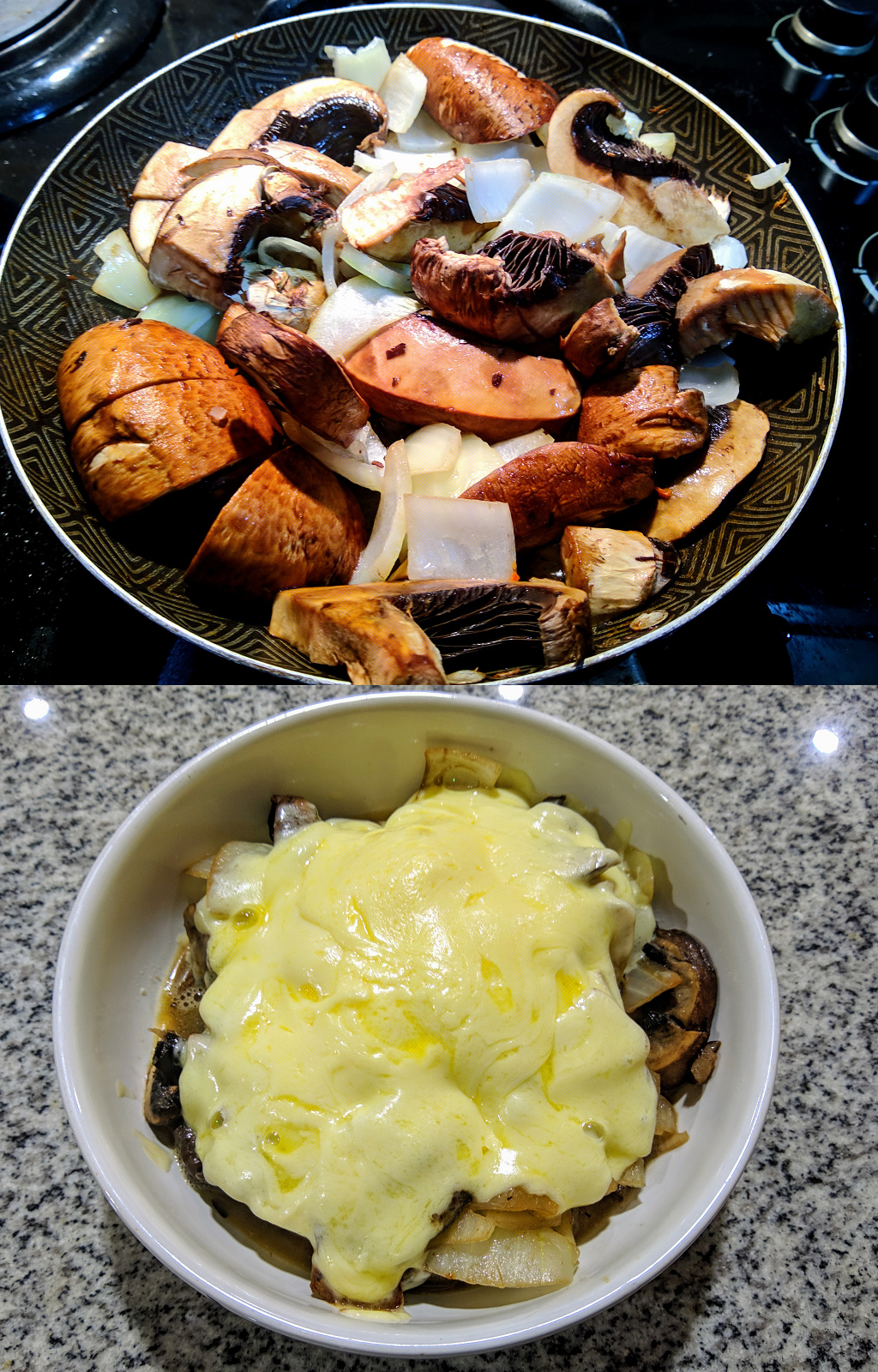 Interesting. I don’t think it looks bad with the cheese on it. There aren’t enough calories in the mushrooms/onions alone to keep me going for an evening anyway. Even with the 200ish cals of cheese, I had to eat some granola later to get to sleep. Just not a lot of cals there.