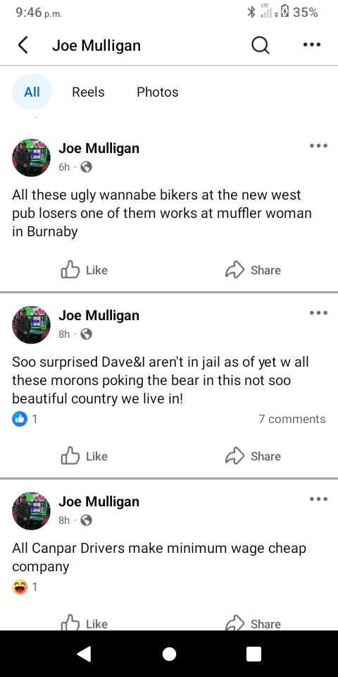 A post office clerk told me today Joe is not a monster. That postal outlet is Thé worst in Canada and I have dealt with them in every province. The long haired White guy with black hair who told me, “ HA says it is okay to sell pot “ inside the Memorial Park washroom while filming me was in the Hope Library my first day there freaking out that I might hurt thieving and lying and sex offender and fraudster Joe Mulligan . About 15 minutes later some White guy 55 ish began hitting two computer monitors and threatening the two librarians on duty somehow the HA guy had managed to disappear only to appear later. Saw him at the green house Thé last house before the Hope Golf Course. He was holding the sliding glass door shut firmly with both hands looking scared.