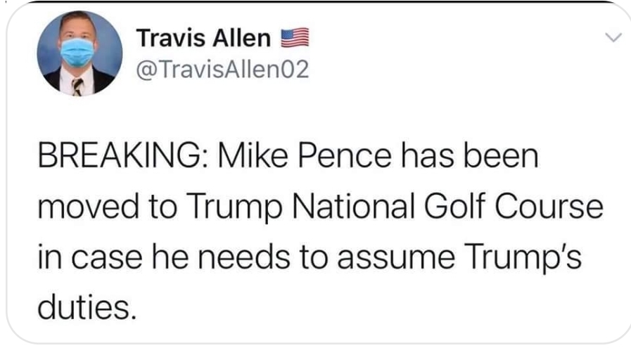 So, I’m honestly fascinated how Trump is going to spin this. “Don’t be afraid of the coronavirus!” “By the way, the entire White House has it.” lol.