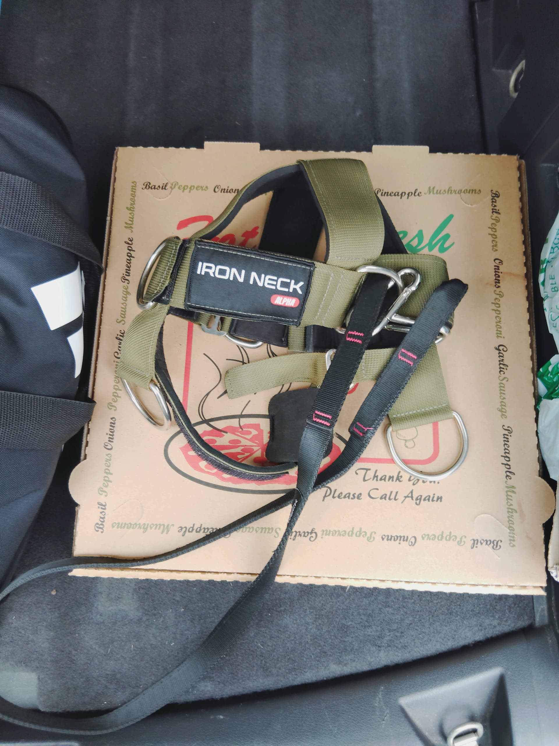 My neck harness. I started using this again and even bringing it to the gym to hook up to cable machine. It’s one of the better quality ones but not as expensive as some resistance band.det with some halo like orbital. I suspend myself at up to 45;degrees sometimes than rep out